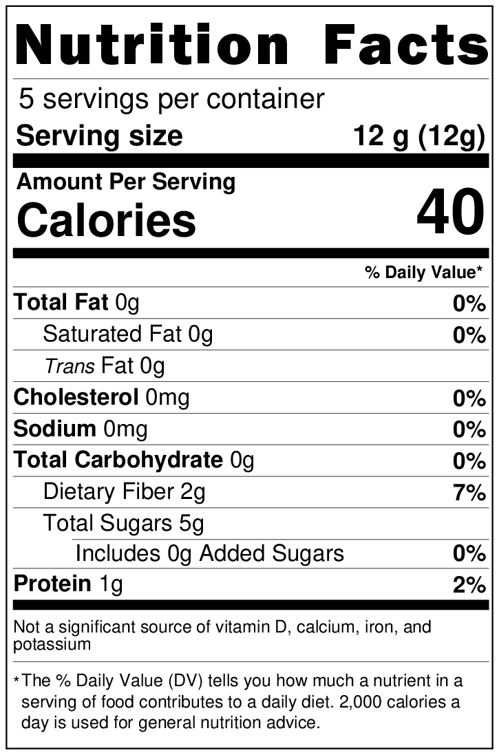 A clean source of Vitamin C and fiber with zero fat and zero sodium. Suitable for keto, paleo, vegan, gluten free, and low carb lifestyles.