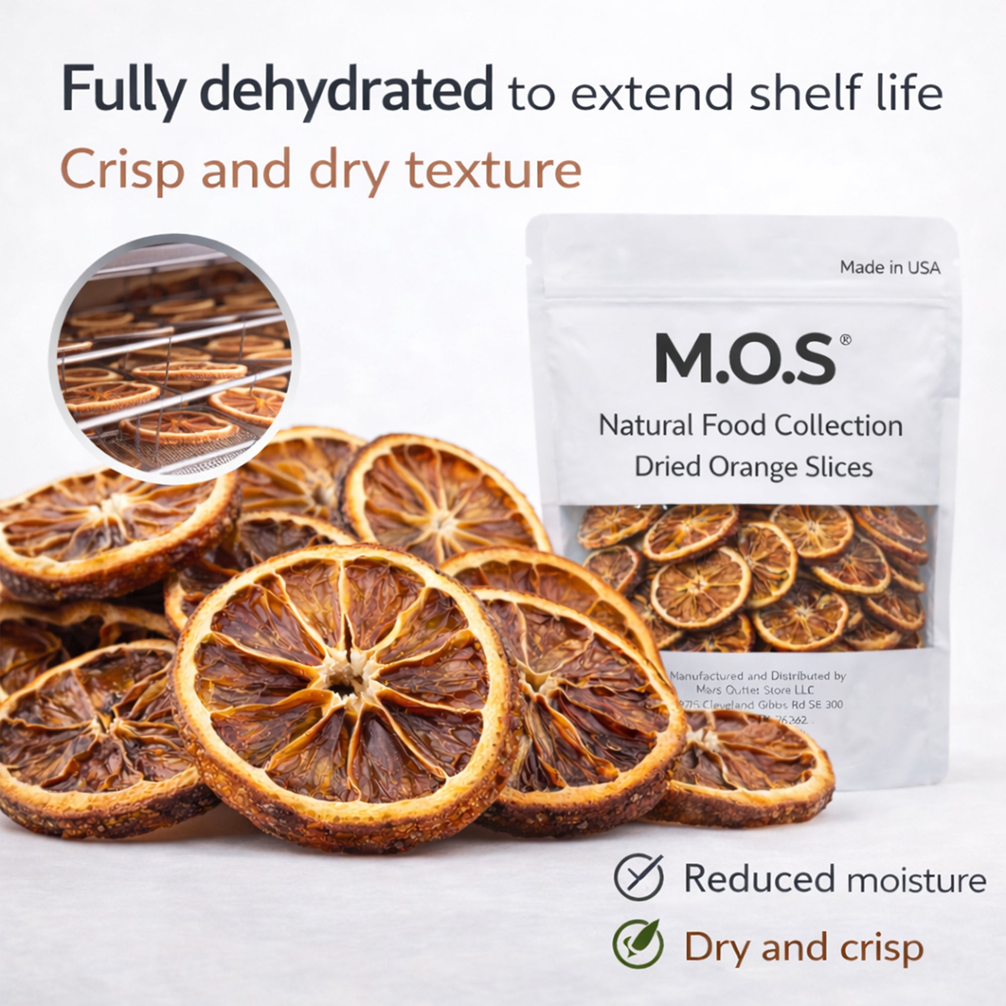 M.O.S Dried Orange Slices, made from premium hand selected California and Texas navel oranges and slowly dehydrated in our FDA registered Texas facility. Crafted in small batches, these orange slices contain zero added sugar, zero preservatives, zero sulfur, and zero artificial ingredients. Only naturally sweet, vibrant citrus flavor.