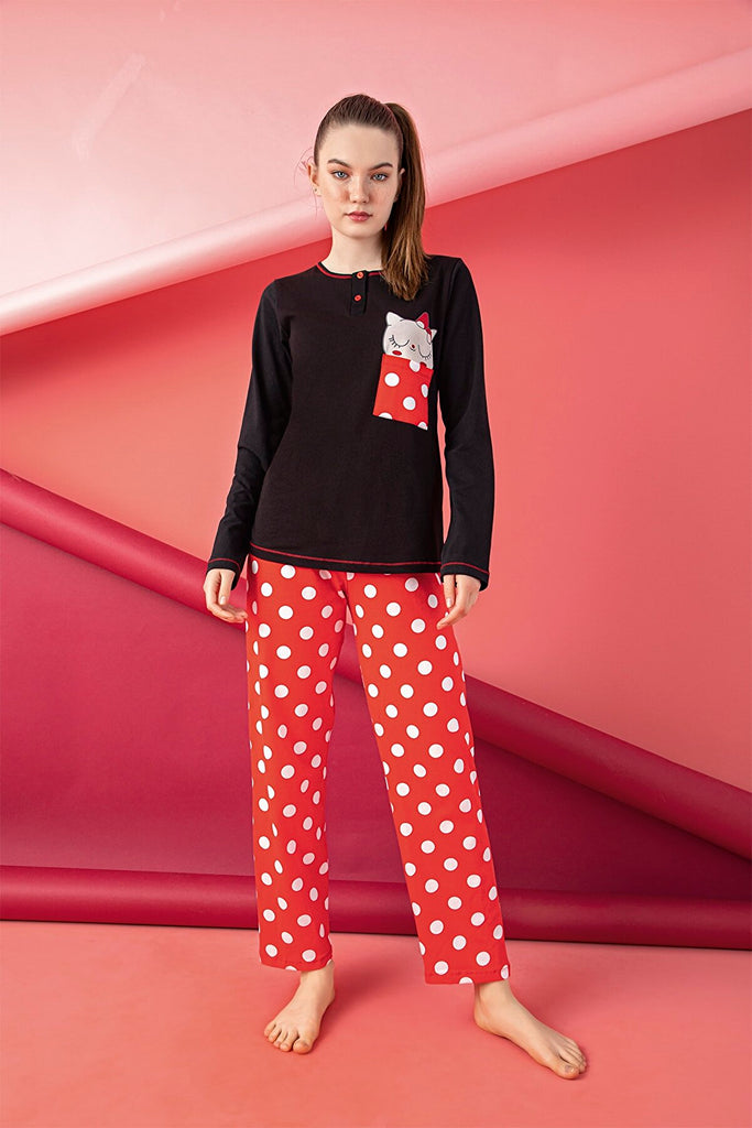 Junior Women’s Cotton Pajama Set – 2-Piece Long Sleeve Top & Pants with Cute Cat Print