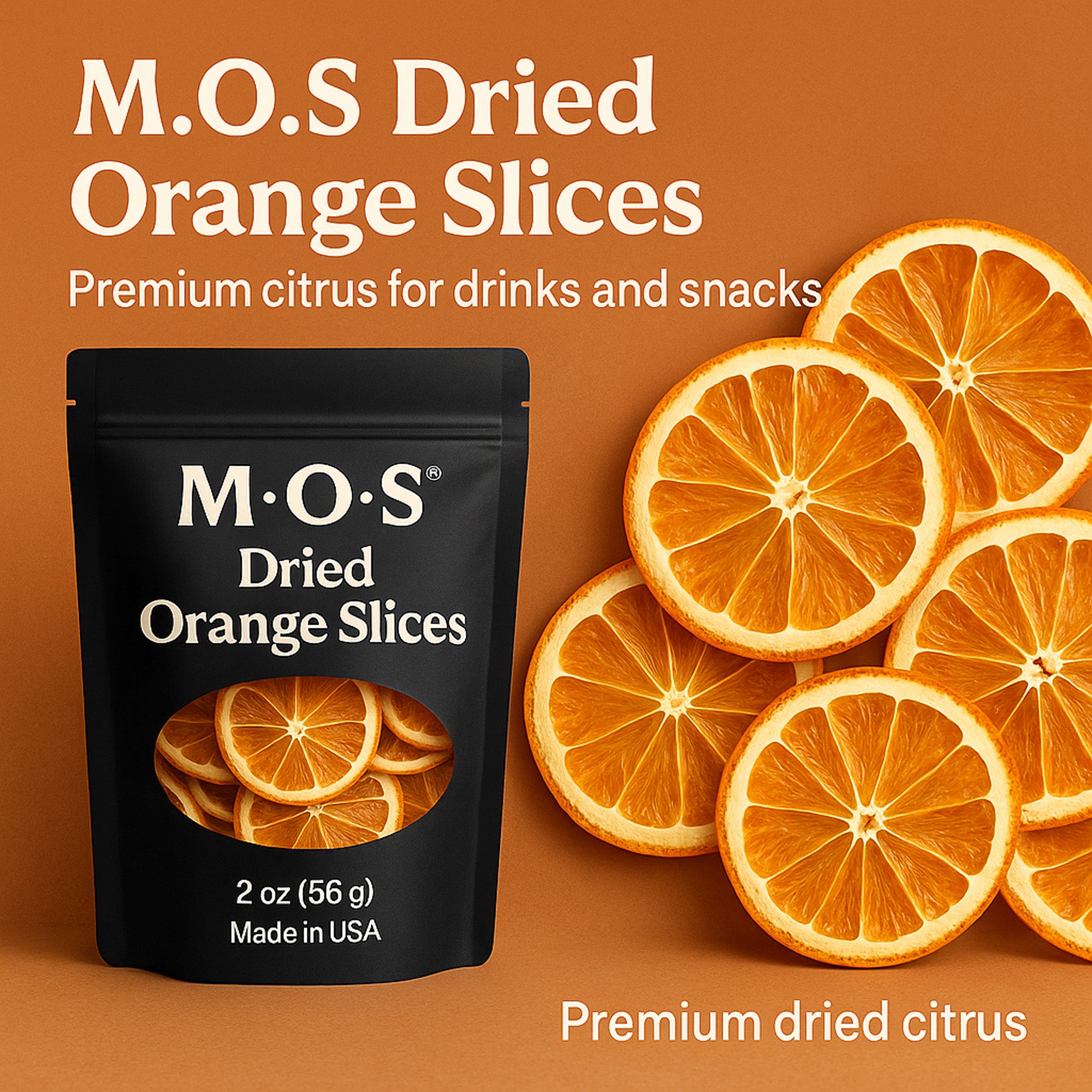 Discover M.O.S Dried Orange Slices – premium hand selected California and Texas navel oranges slowly dehydrated in our FDA registered Texas facility. Made in USA with zero sugar zero preservatives zero sulfur and zero artificial ingredients – only pure naturally sweet orange slices.