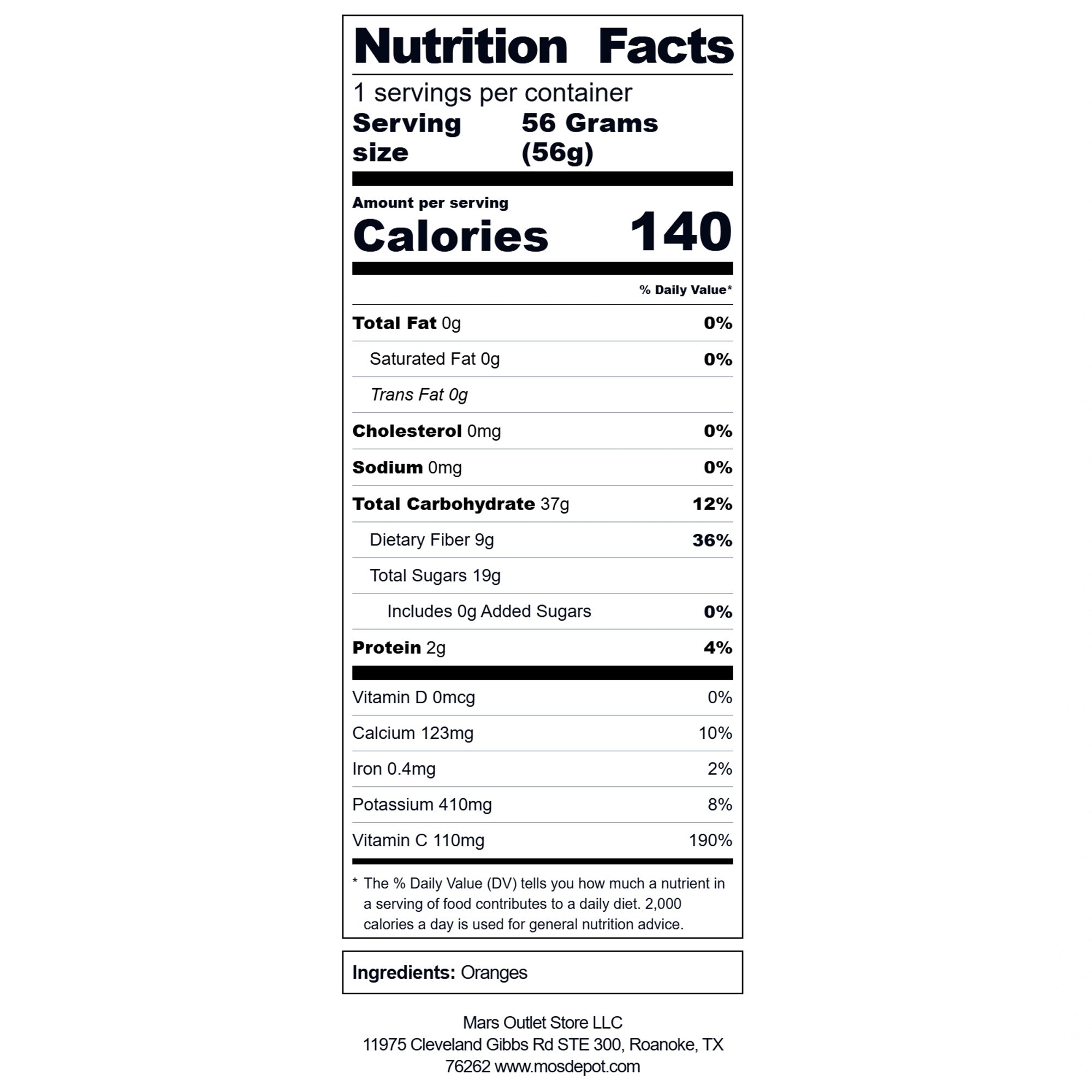 Hand selected California and Texas navel oranges slowly dehydrated in our FDA registered Texas facility with zero added sugar preservatives sulfur or artificial ingredients.