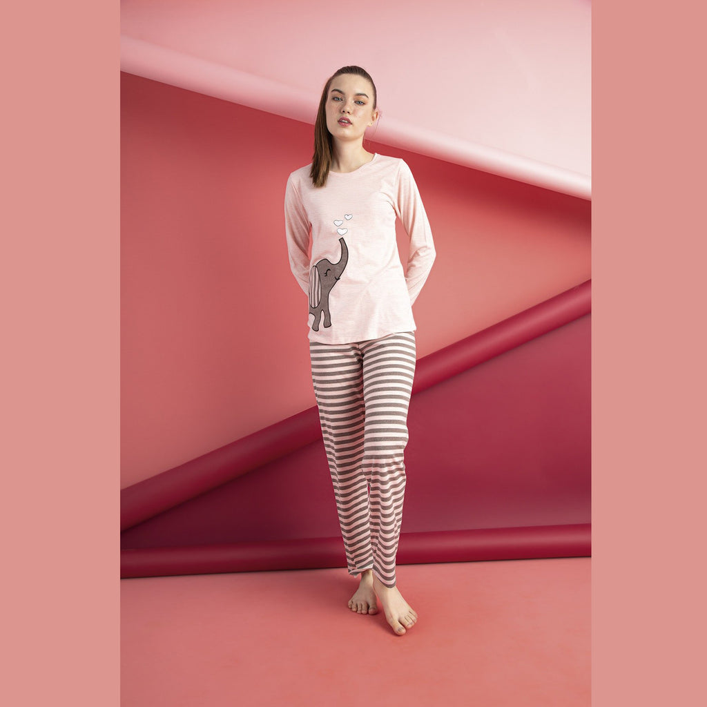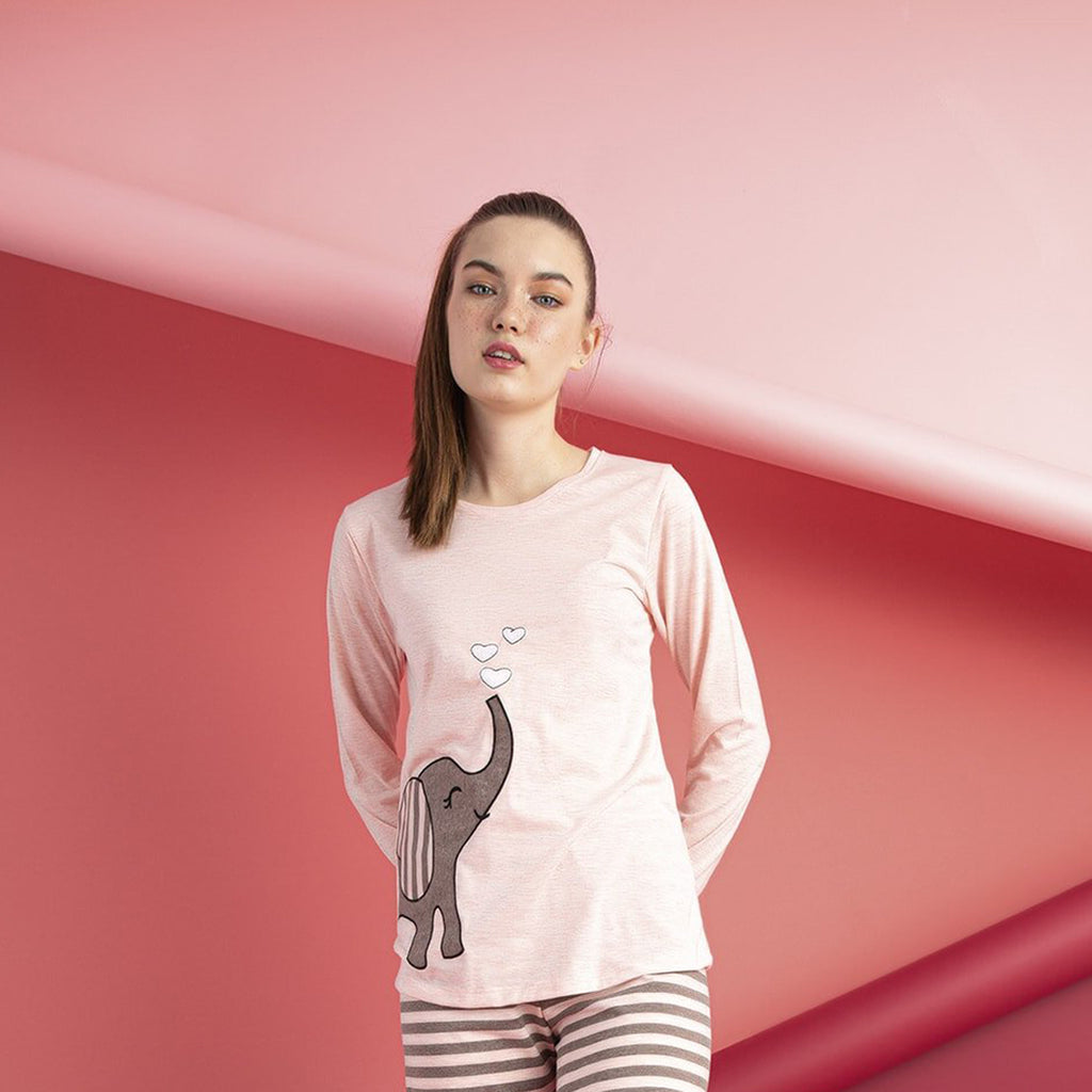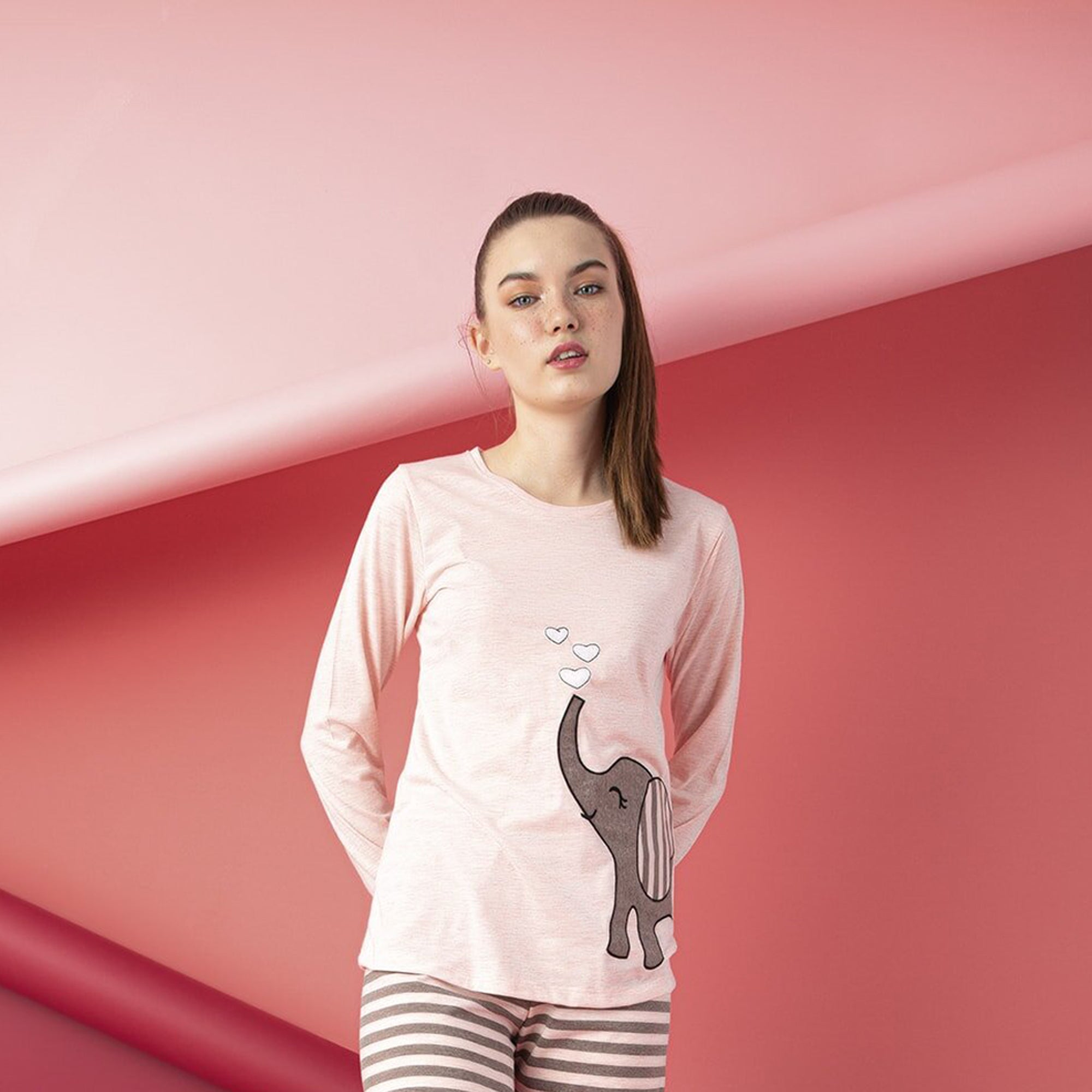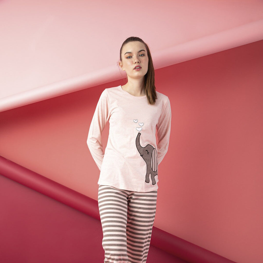 The long-sleeve top features a round neckline and playful printed design, while the full-length pants include an elastic waistband and adjustable drawstring closure for a personalized fit. Together, they create the perfect balance of comfort and style for lounging or sleeping.