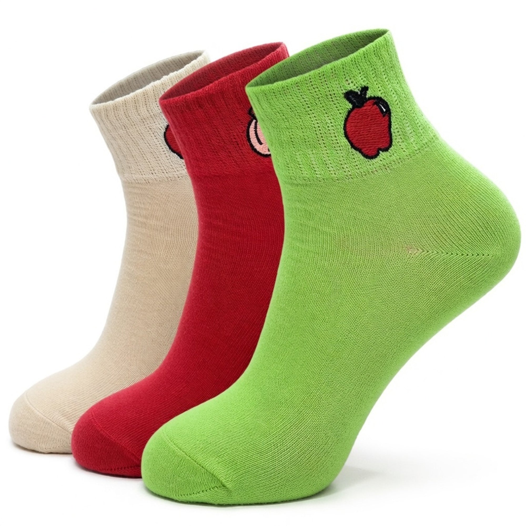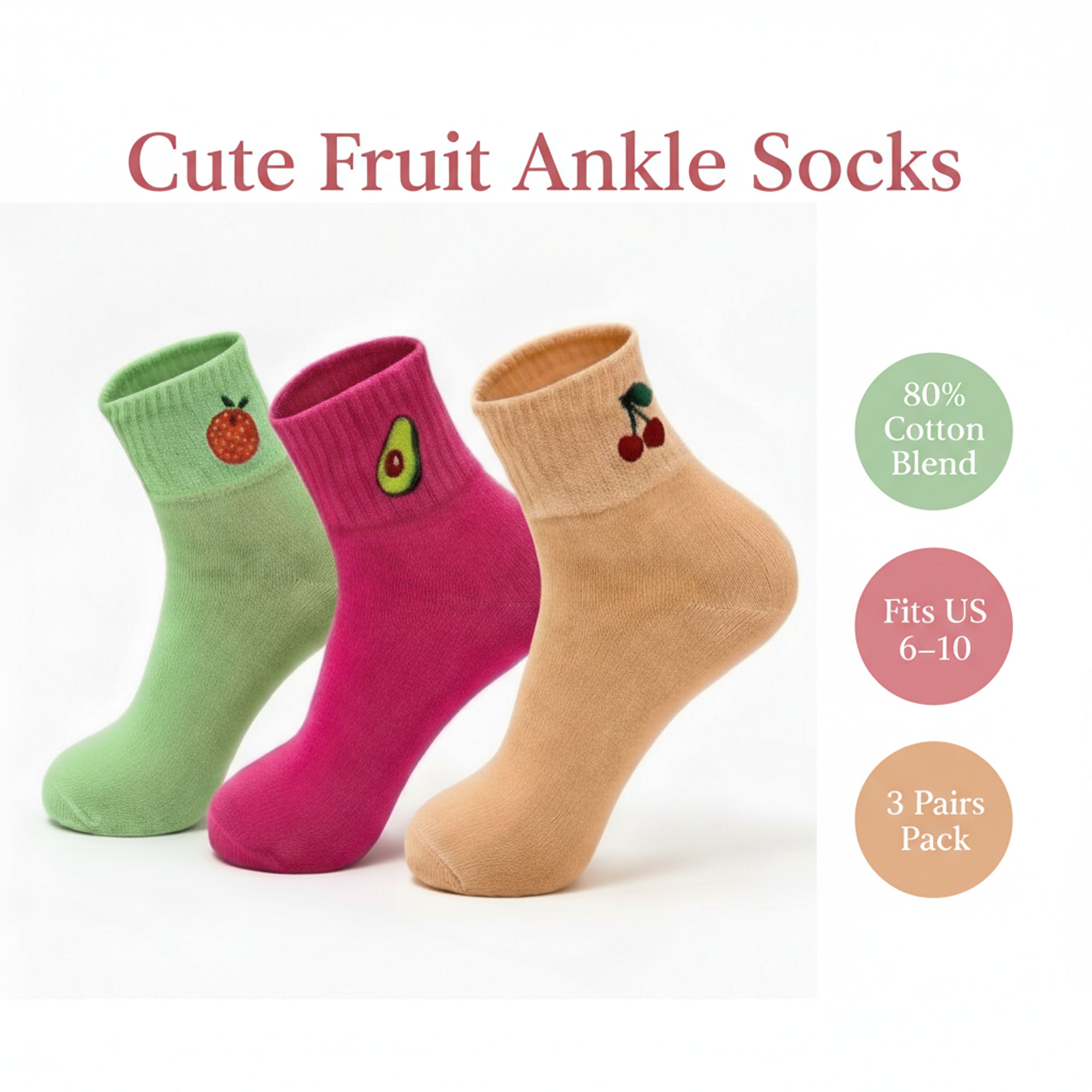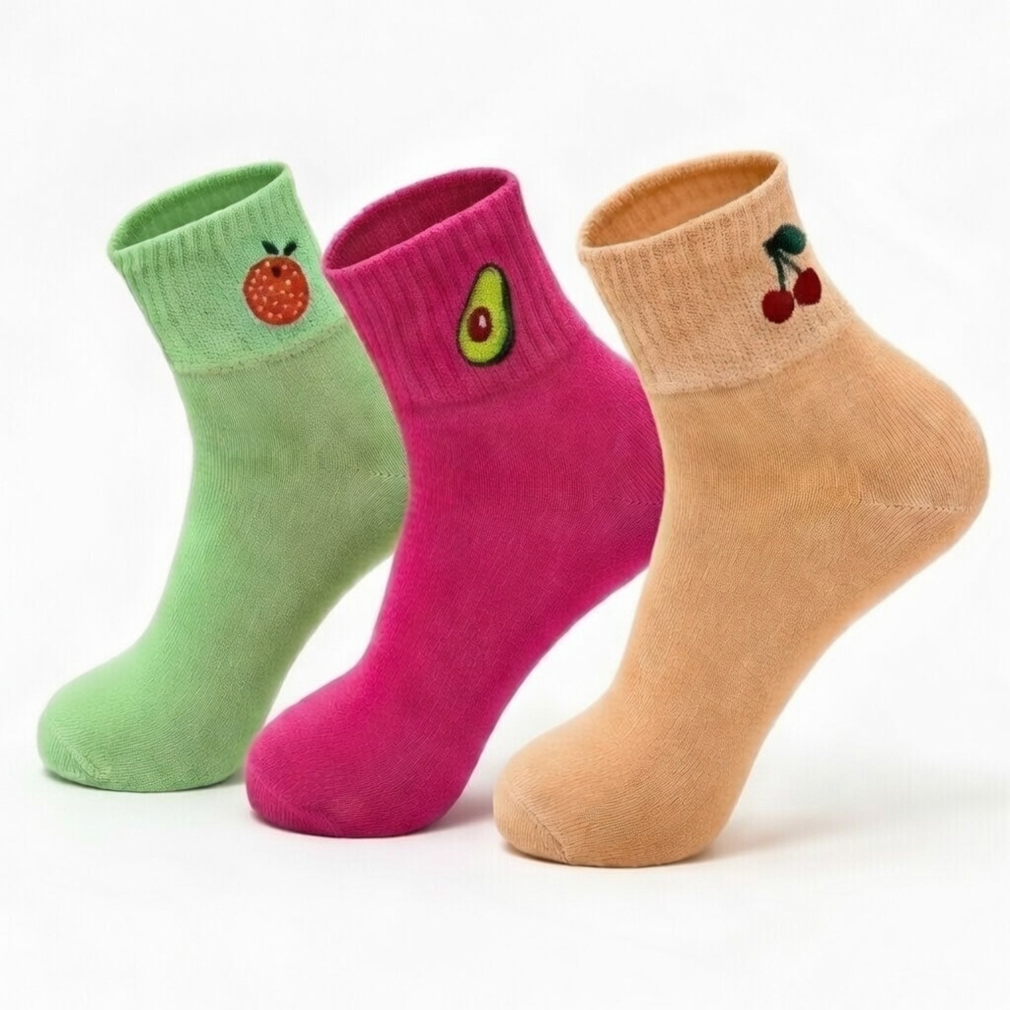 Cute Cotton Ankle Socks for Women. Designed for comfort and style, this 3-pair pack features vibrant fruit embroidery including avocado, strawberry, and cherry designs that add personality to any outfit.