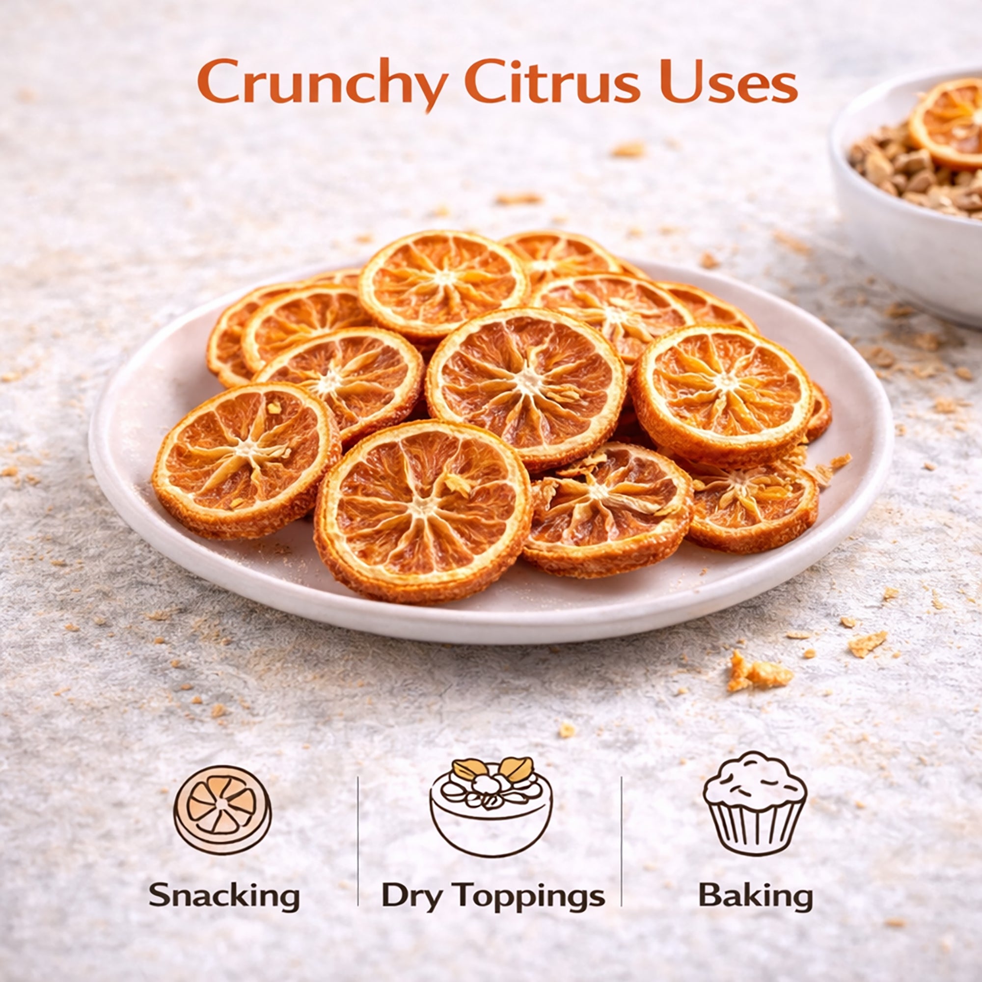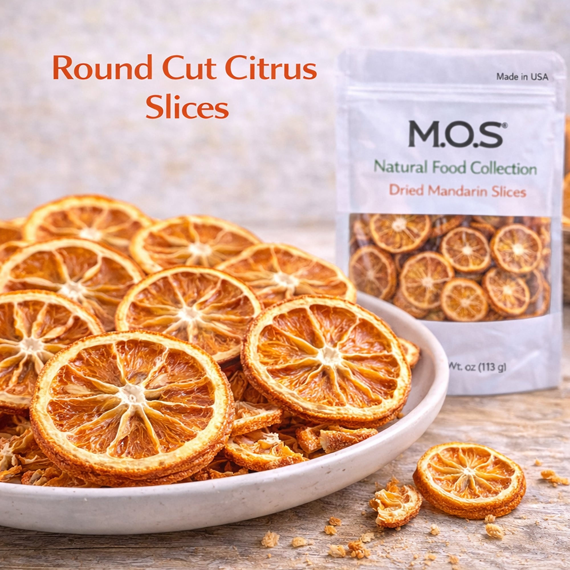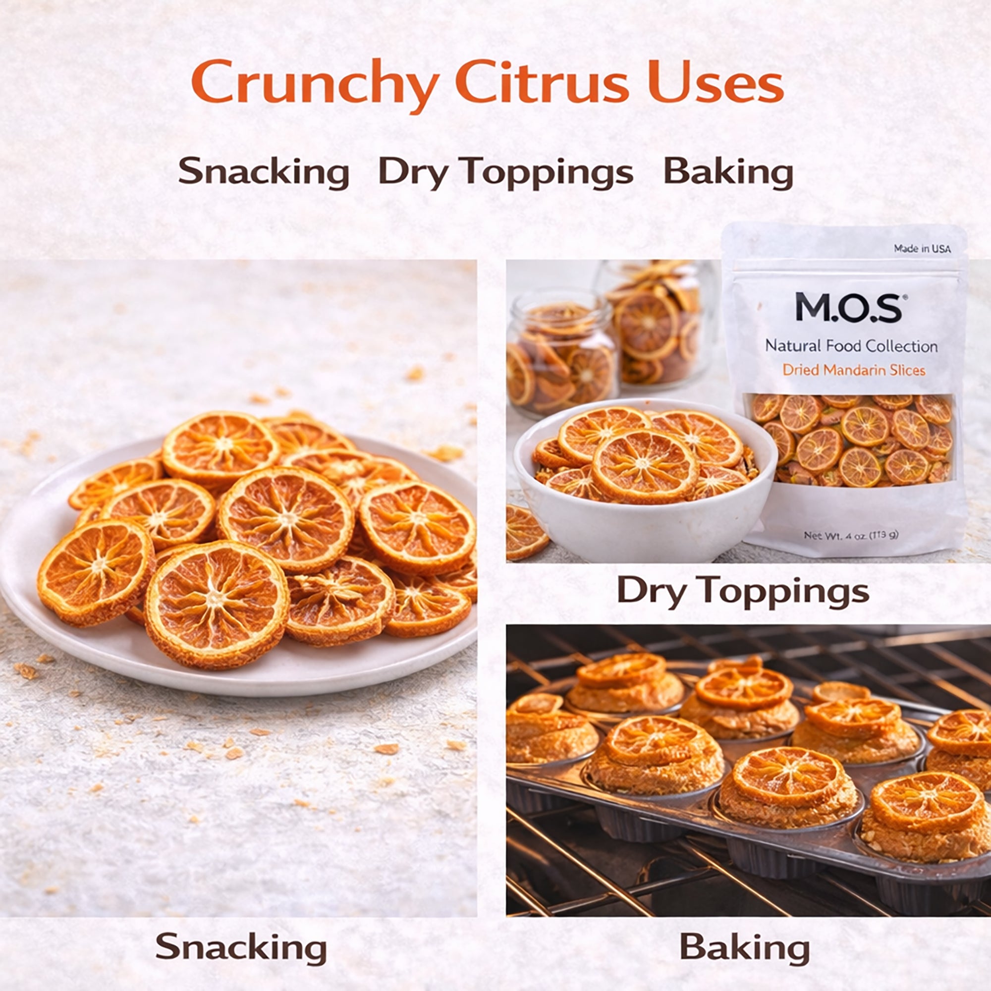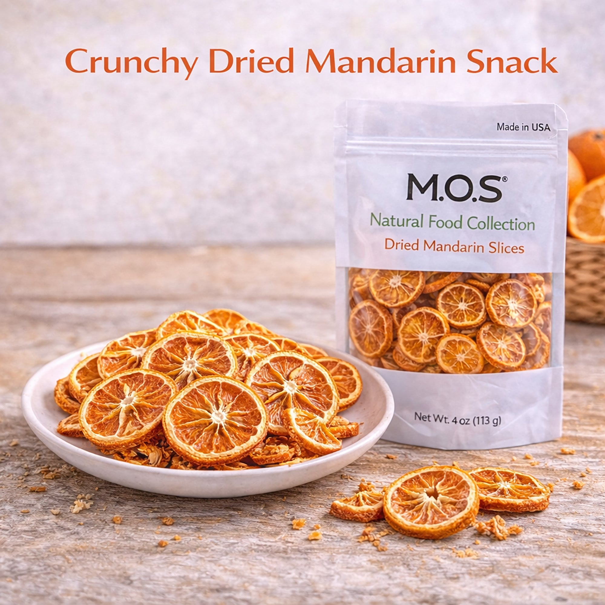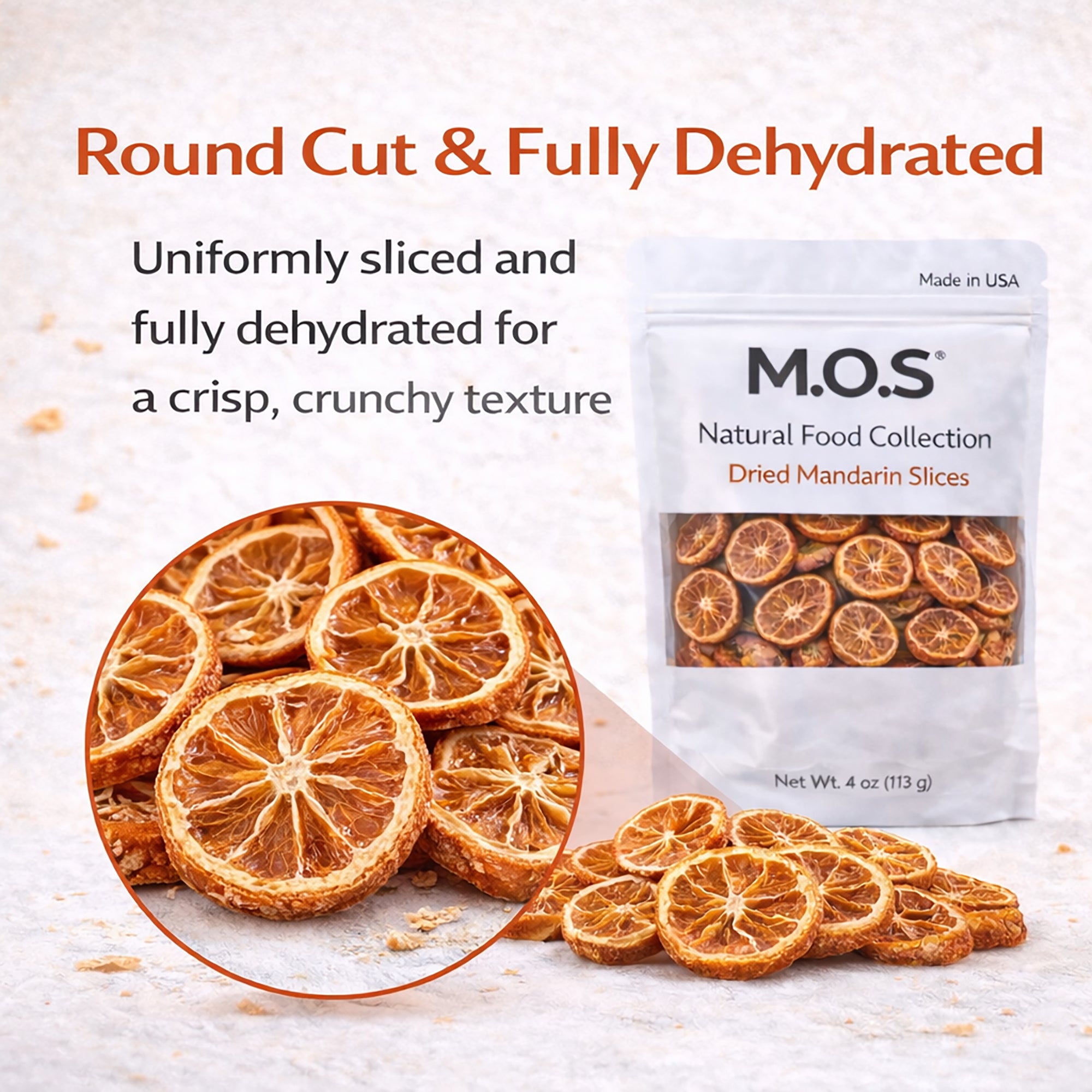 Dried Mandarin Orange Slices 4 oz are made from real mandarin oranges and carefully dehydrated to preserve natural citrus flavor, aroma, and texture. This dehydrated citrus fruit is produced using a gentle drying process without frying or artificial processing methods. The result is clean, naturally sweet dried mandarin slices with a firm texture and authentic fruit taste.