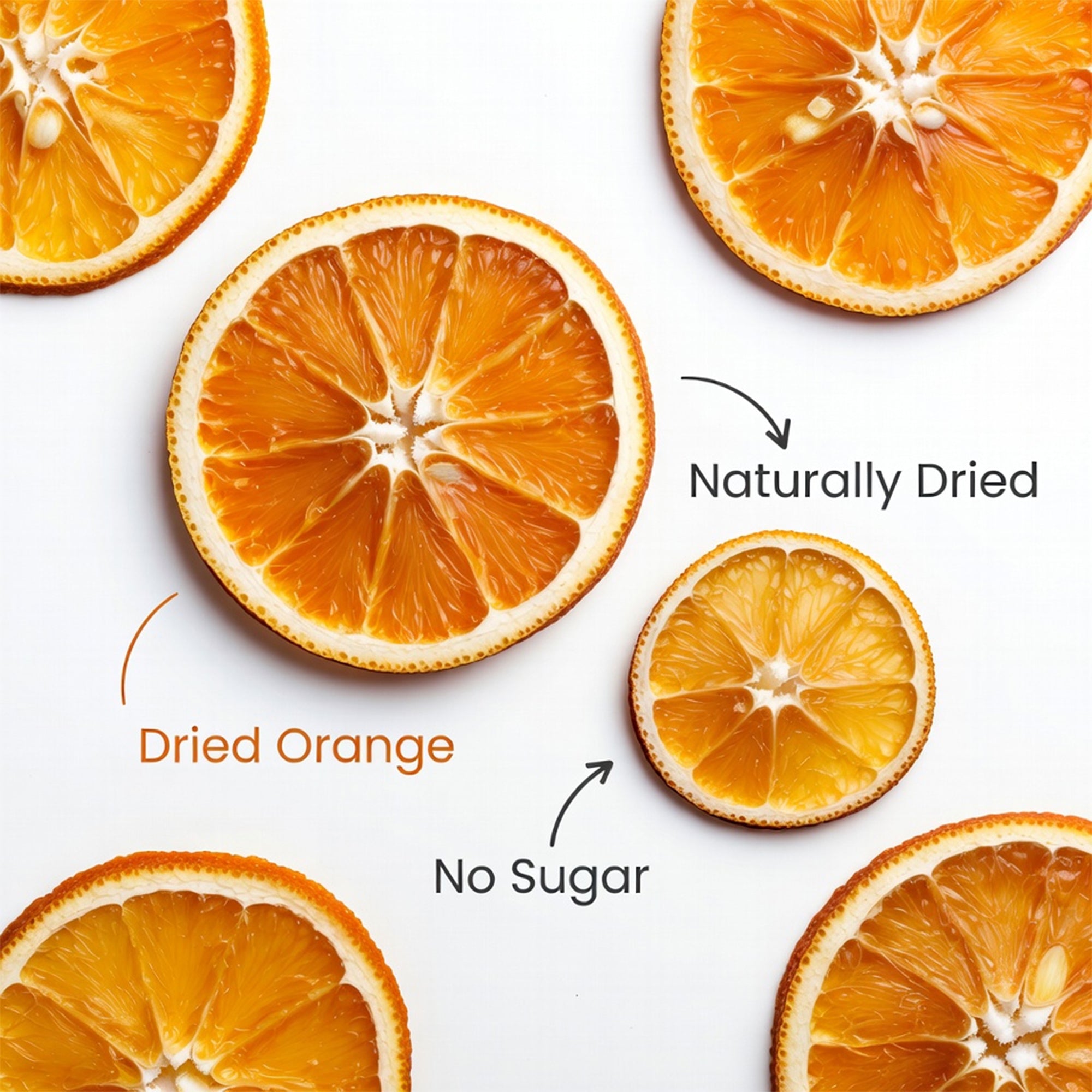 M.O.S Dried Orange Slices are made from real oranges that are carefully machine sliced and naturally dehydrated to preserve their authentic flavor, aroma, and texture. Each slice includes real orange peel and a naturally wrinkled dried appearance that reflects a slow and controlled drying process.