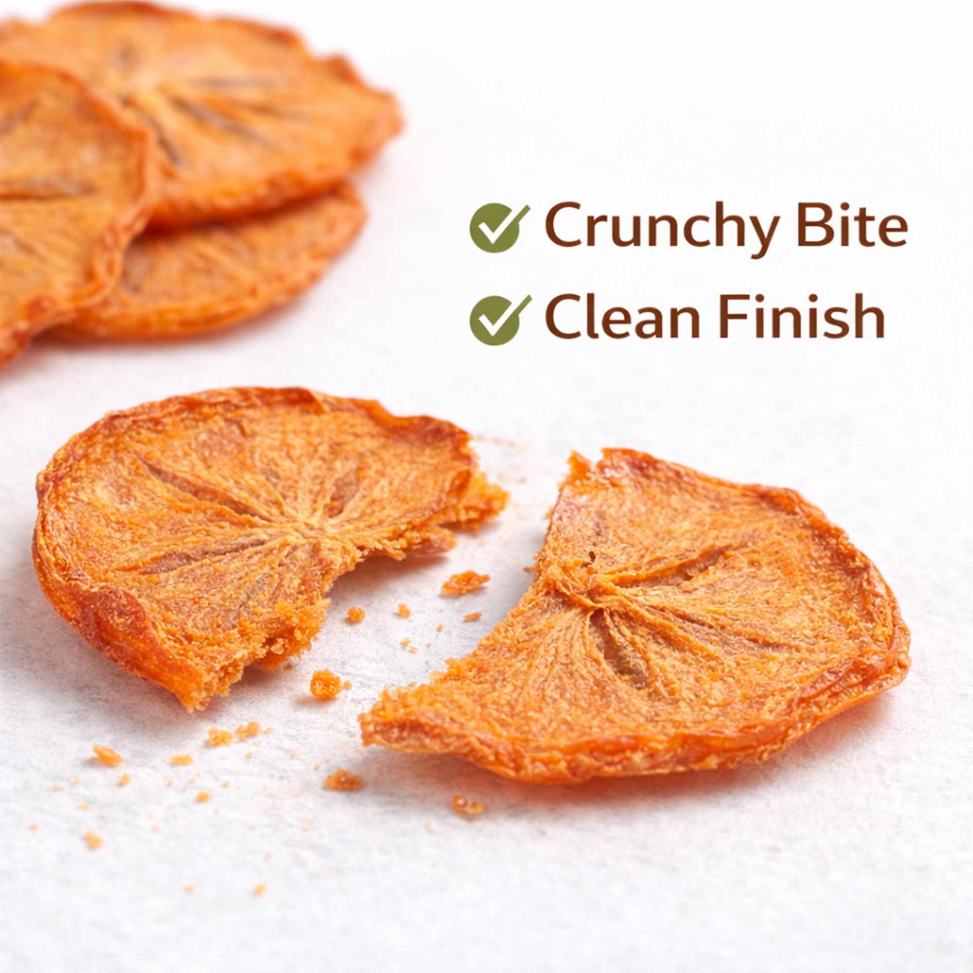 Our dried persimmons are made with just one ingredient – persimmon fruit. Nothing more. No added sweeteners. No fillers. No shortcuts. Each slice is thinly cut and dried to achieve a crisp, chip-like texture that sets it apart from soft or chewy dried fruit.