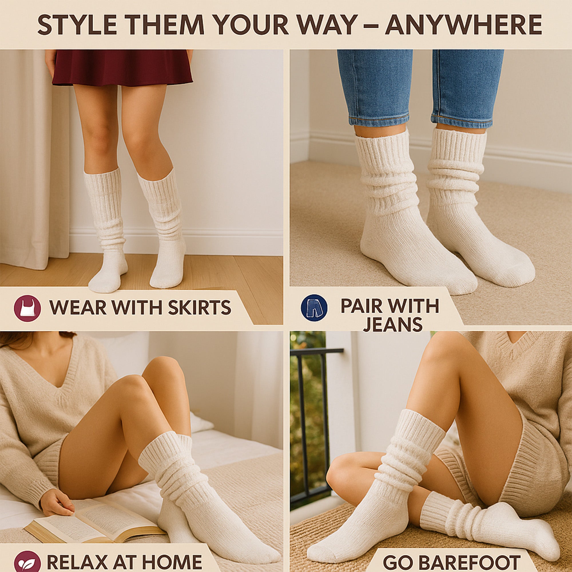 - Wear Them 3 Ways for Versatile Styling – Pull them knee-high for warmth, slouch them mid-calf for a relaxed look, or scrunch them down for an ankle-length retro vibe.