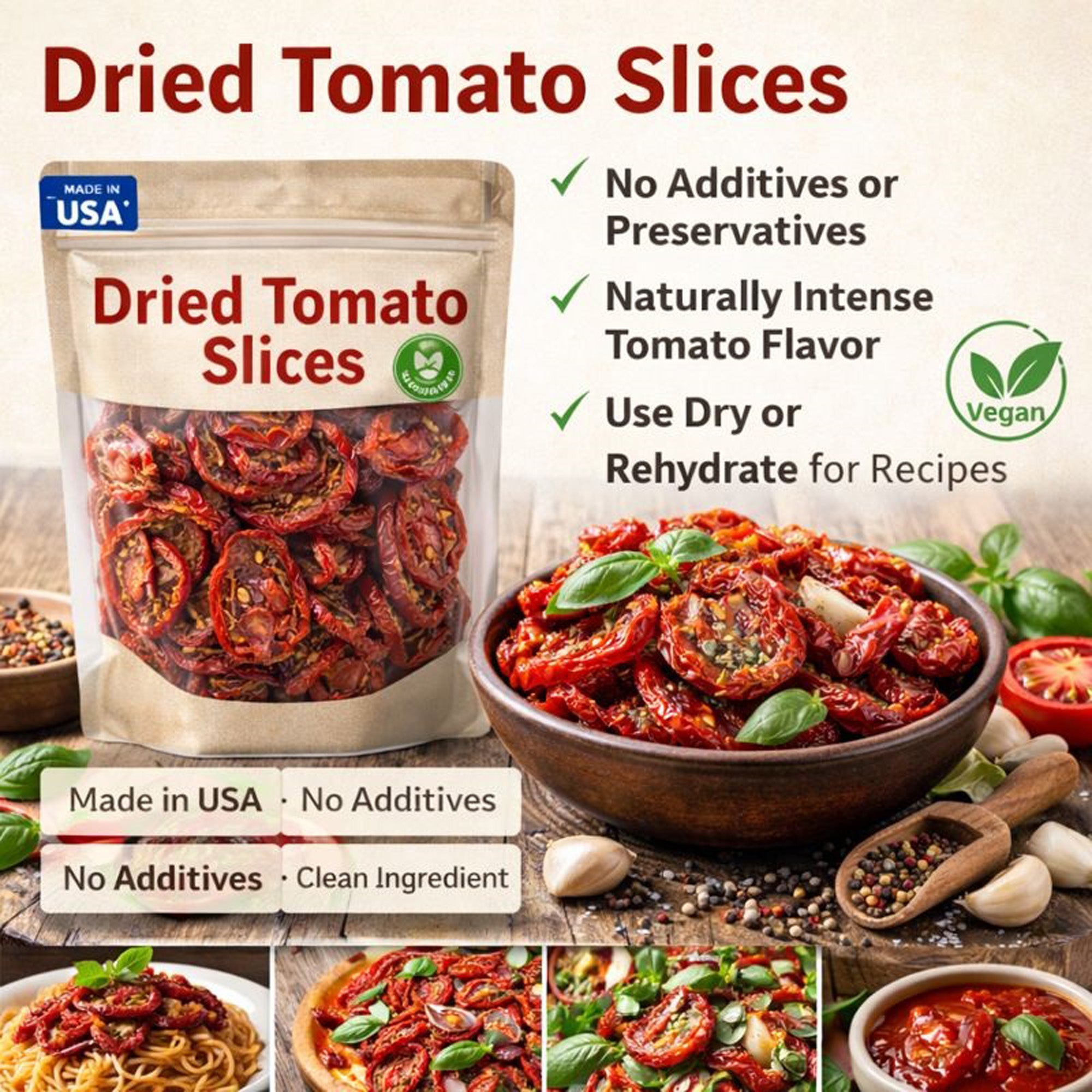 Use the slices straight from the bag for concentrated flavor, or rehydrate them in water to achieve your desired texture. Whether you’re a home cook, meal prepper, or plant-based eater, these dried tomato slices are a versatile pantry essential.