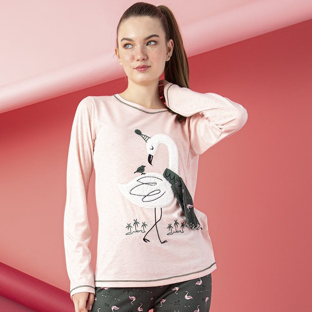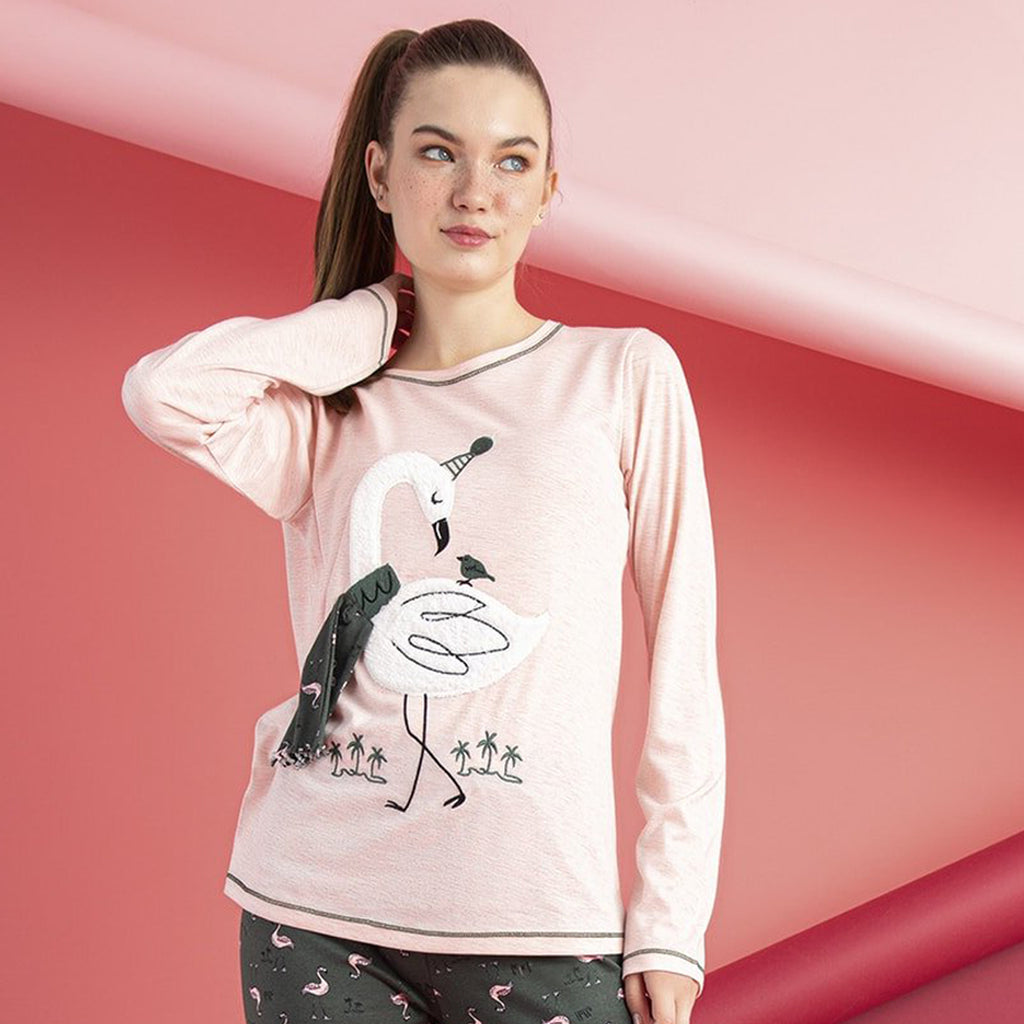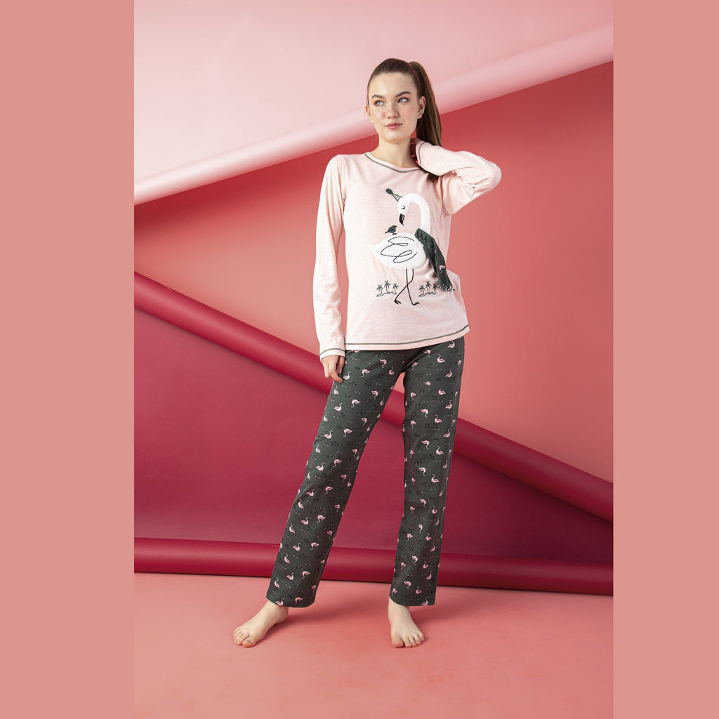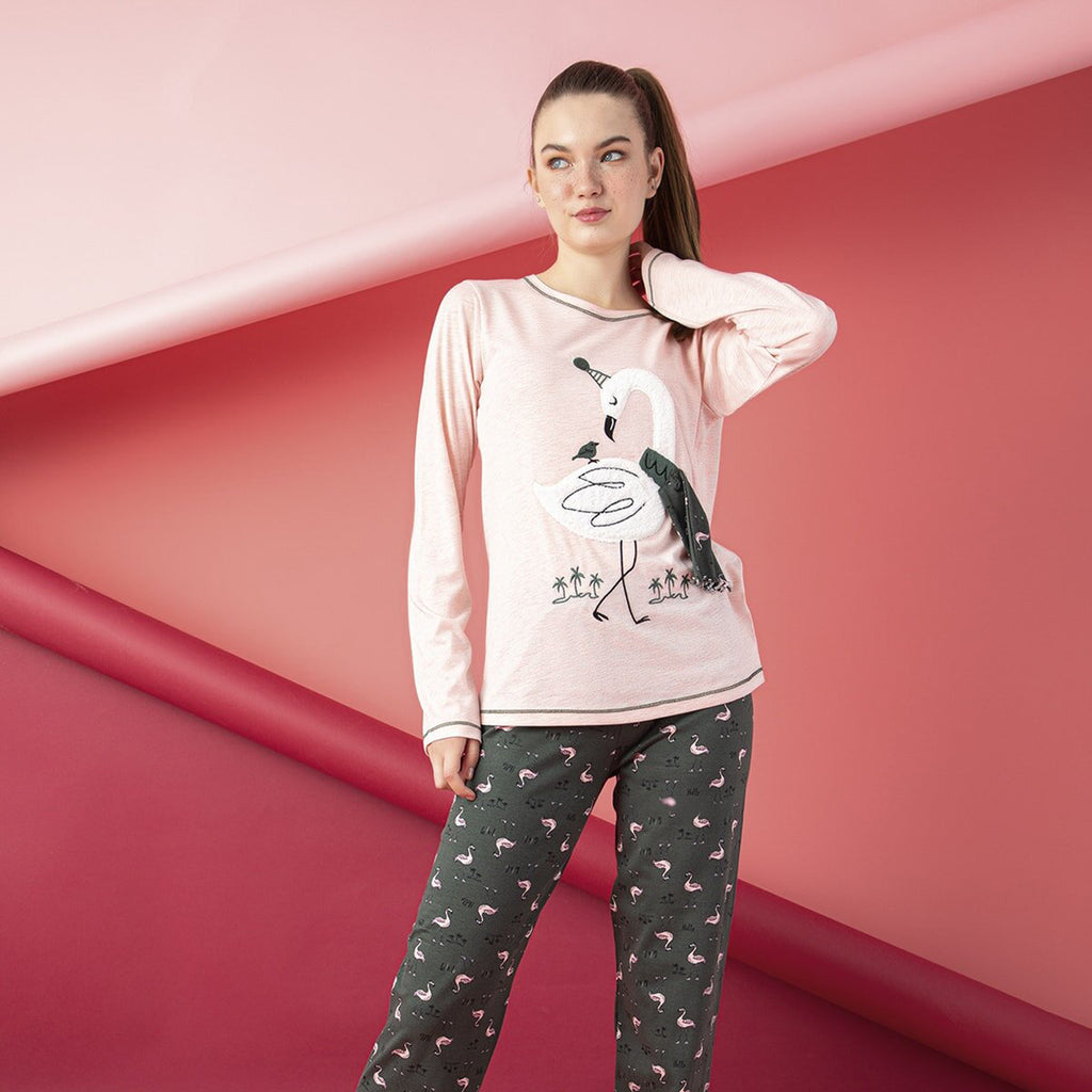 This pajama set includes a long-sleeve top with a classic round neckline and playful printed design, paired with full-length pants featuring an elastic waistband and adjustable drawstring for a personalized fit. The lightweight cotton blend ensures all-night comfort, perfect for lounging at home or enjoying restful sleep.