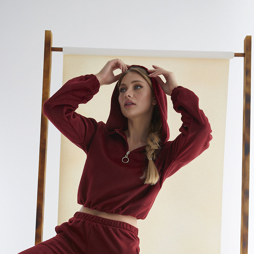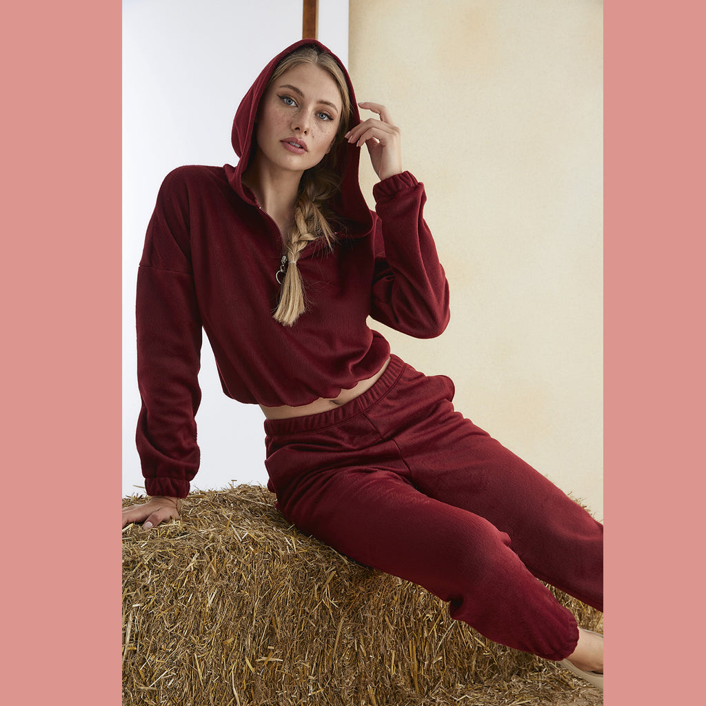 Women’s Junior Cotton Pajama Set – 2-Piece Rich Red Hoodie & Long Pants Loungewear